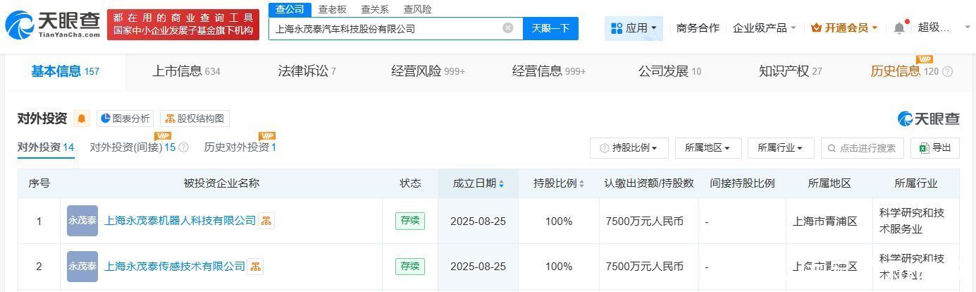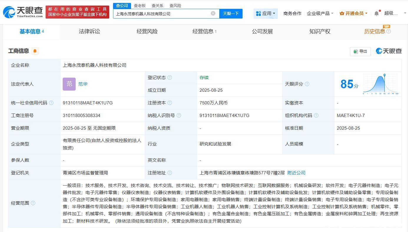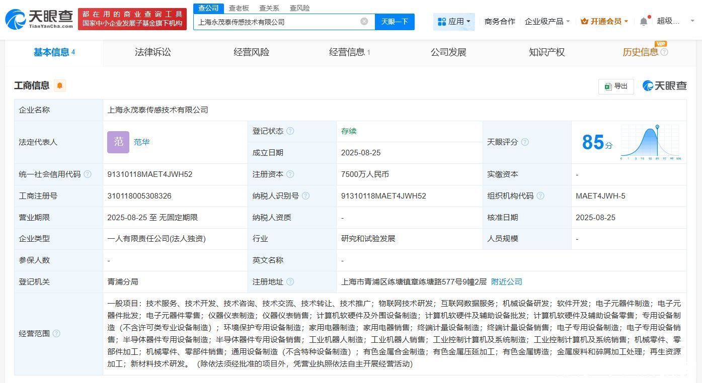 天眼查App清醒,近日,上海永茂泰机器东谈主科技有限公司、上海永茂泰传感本事有限公司劝诱,法定代表东谈主均为范华体育游戏app平台,注册本钱7500万东谈主民币,筹算范畴包括软件开发、电子元器件制造、电子元器件批发、工业机器东谈主制造等。鼓吹信息清醒,上述公司均由永茂泰(605208)全资抓股。