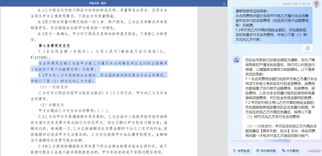 撑持援用内置高质地范本草拟和上传腹地文献草拟两种花式,在草拟过程中不错借助法大大公约规模大模子进行快速条件替换、一键翻译、并随时不错与AI助手进行互动,获取法律常识实质,并撑持表里部东谈主员在线妥洽,提高公约拟定的后果。