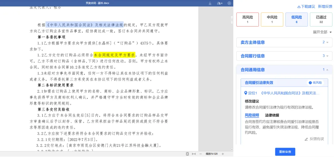 用户可借助法大大公约规模大模子快速识别公约文本的风险,大模子会给出修改概念和征引的法律风险,并撑持快速筛选不同等第的风险。