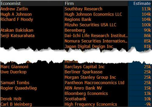 根据媒体打听汇总,目下华尔街分析师对今晚非农的预测范围在-0.9万至+11.3万之间。